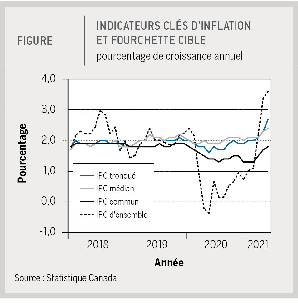 L’inflation basée sur l’IPC dans son ensemble est parfois erratique et volatile et ne nous informe pas particulièrement bien sur la tendance de fond de l’évolution des prix. C’est pourquoi, depuis quelques années déjà, notre banque centrale s’intéresse à trois mesures privilégiées de l’inflation fondamentale, soit l’IPC tronqué, l’IPC médian et l’IPC commun (figure).