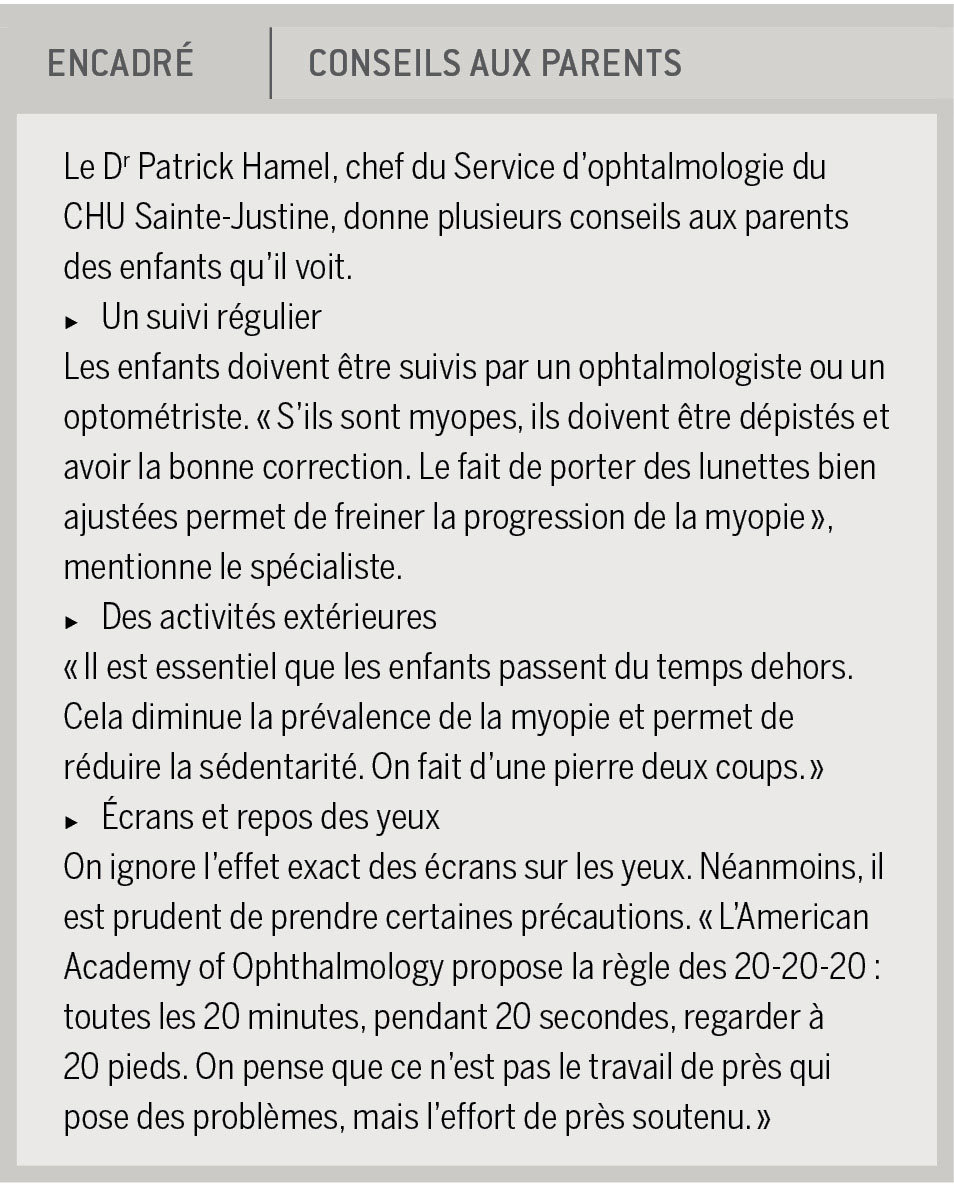 Il reste par ailleurs beaucoup d’autres inconnues. Combien d’heures l’enfant doit-il rester à l’extérieur ? On l’ignore. « Mais on sait que plus longtemps il est exposé à la lumière solaire, plus son risque de devenir myope diminue », indique le Dr Hamel, également professeur agrégé à l’Université de Montréal. Le bienfait d’être à l’extérieur ne consisterait-il pas simplement à réduire le temps d’écran ? On ne connaît pas la réponse. Pour la lecture, qui semble liée à la myopie, un tel lien toutefois n’existerait pas. « La science montre que l’exposition à la lumière solaire est un facteur indépendant de la lecture. »