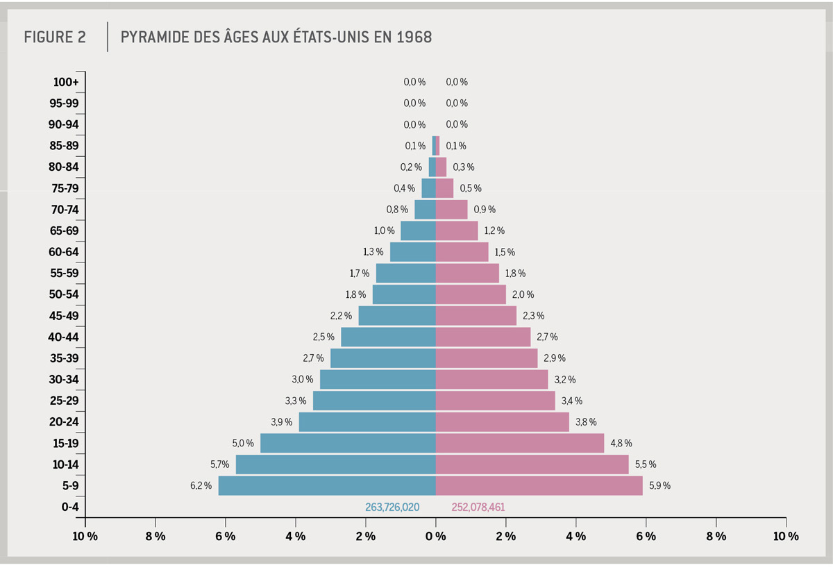 La démographie était radicalement différente dans les années 1960 : les personnes âgées étaient peu nombreuses, et le nombre de jeunes de moins de 30 ans était en augmentation, ce qui garantissait une main-d’œuvre abondante pour les années à venir. |