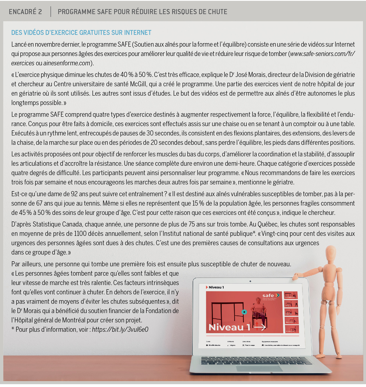 L’activité physique constitue, elle, une mesure clé. Le médecin peut proposer à ses patients les plus vulnérables le programme en ligne SAFE (Soutien aux aînés pour la forme et l’équilibre) que le Dr Morais a récemment mis au point (encadré 2). La marche, pour sa part, est toujours conseillée, mais peut être plus exigeante. « Les études disent qu’il faut idéalement effectuer 10 000 pas. Néanmoins, on voit des bienfaits après 4000 pas, ce qui correspond à environ 30 minutes d’exercice. » Autres mesures importantes : revoir les médicaments, entre autres ceux qui provoquent la sécheresse de la bouche, et s’assurer que la personne âgée reçoit les services de soutien à domicile dont elle a besoin.