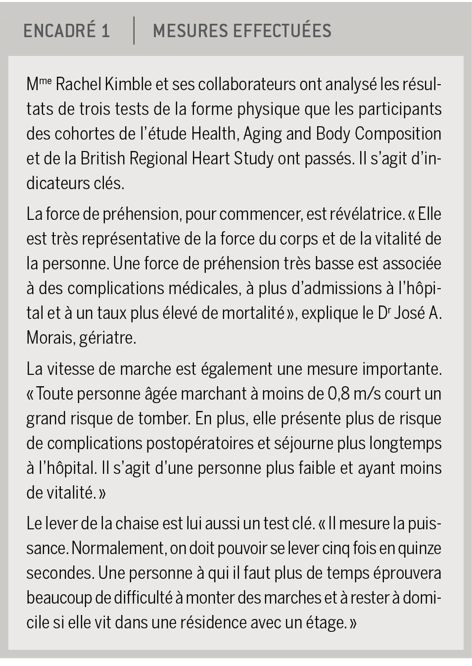 Au début des deux études, les participants ont passé un examen physique, eu une évaluation buccodentaire et rempli un questionnaire. Ils ont également effectué des tests mesurant trois facteurs : la vitesse de marche, la rapidité du lever de la chaise et la force de préhension (encadré 1).