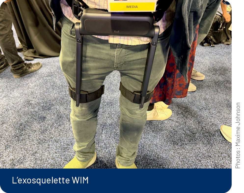 Le WIM du fabricant d’exosquelettes sud-coréen WIRobotics, par exemple, pèse 1,6 kg et tient dans une petite sacoche lorsqu’il est replié. En Europe, celui-ci est vendu environ 4000 $. Il se porte autour des hanches et des genoux, et devrait notamment permettre de marcher plus rapidement et avec une plus grande stabilité selon le fabricant.