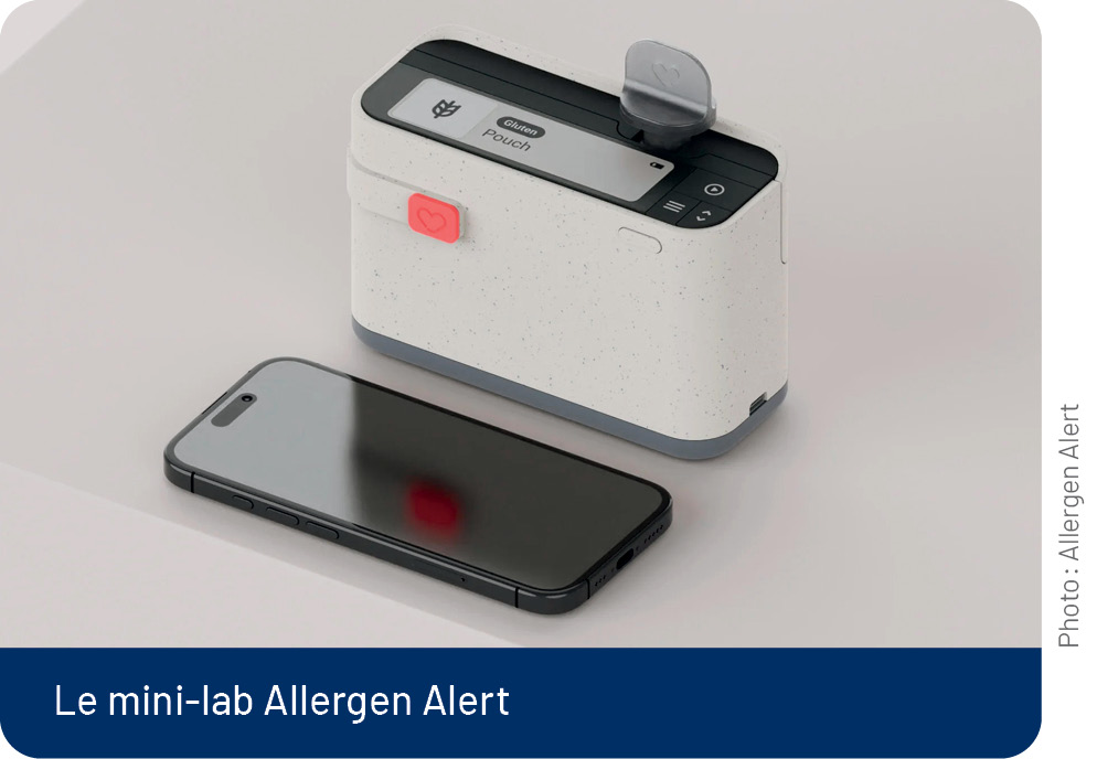 L’appareil – baptisé mini-lab – est fondé sur une technologie héritée de l’entreprise française de diagnostic in vitro bio­Mérieux. On insère la nourriture dans une petite pochette à usage unique, et l’appareil détecte la présence d’un allergène (seuil de détection de 5 parties par million) en deux minutes.